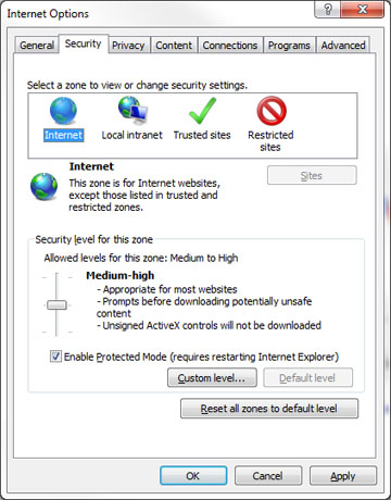 Another thing to check is the security level set in the browser. In Internet Explorer, go to Tools, then Internet Options. Select the Security tab. Select "Internet" or "Local intranet" depending on how you access VPC at your site. Make sure that the security level for "Internet" is set no higher than Medium-high (which is the default) or Medium-low (the default) for "Local intranet". If you are using a custom level, you need to ensure that "Scripting of Java Applets" under "Scripting" is enabled.