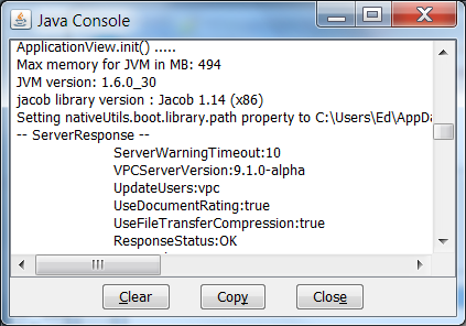 Java Console and re-launch VPC. Scroll down from the top of the console and look for a line that begins with " xx:xx:xx|jacob library version: ". If it is blank after that, or it says "Unknown jacob version" see