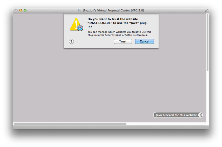 - The first time you launch VPC after the new OS is installed you may see a message in the VPC window saying Java is blocked for this website. Click on the message and another message is opened saying "Do you want to trust the website...to use the "Java" plug-in?"