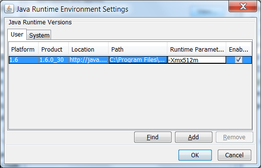 - After the JRE has been installed, open the Java Control Panel. Select the "Java" tab. Click on the "View..." button. Make sure the User tab is selected. A table for JRE settings should be displayed with a row for the 1.8 Platform. If there is more than one row, be sure to use the appropriate row for the JRE you just installed. Note: we recommend that only one JRE be installed (or, at least enabled) on your system if possible. Double-click in the Runtime Parameters column in that row which will open it in edit mode. Enter "-Dsun.java2d.dpiaware=false" without the quotes and hit Enter. Then click on OK twice to close the panel and save the changes.