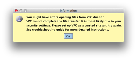 With VPC still open, open Preferences in Safari. Go to the Security tab and click on the button that says "Manage Website Settings". On OS X 10.11, from the Security tab, select Internet Plug-Ins and then Plug-in Settings. In all cases, in the new window that pops up select Java from the list on the left. On the right side you will see the website in which you trusted java to run - your VPC server URL. You will only see this URL if you still have the VPC index page open. Click on the pull down menu next to it that says "Allow". Select "Run in Unsafe Mode". In the window that pops up, click on "Trust". Then click on "Done" to apply the change. This setting will only effect your VPC website. It will allow VPC to access the local filesystem.